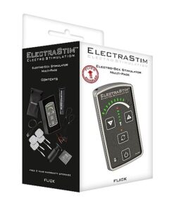El paquete de ElectraStim Flick EM60-M incluye un estimulador, todos los cables necesarios, un conjunto de 4 ElectraPads, 2 anillos para el pene ajustables ElectraLoops y un electrodo Silicone Noir Aura (adecuado para su uso vaginal y anal).