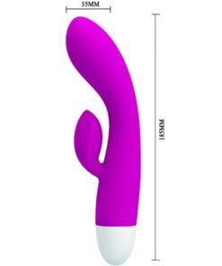 Este recargable vibrador con rabbit de Pretty Love está hecho de suave silicona de alta calidad. El eje del vibrador está angulado para llegar prefectamente al punto G mientras la parte de rabbit suave y flexible estimula el clítoris.